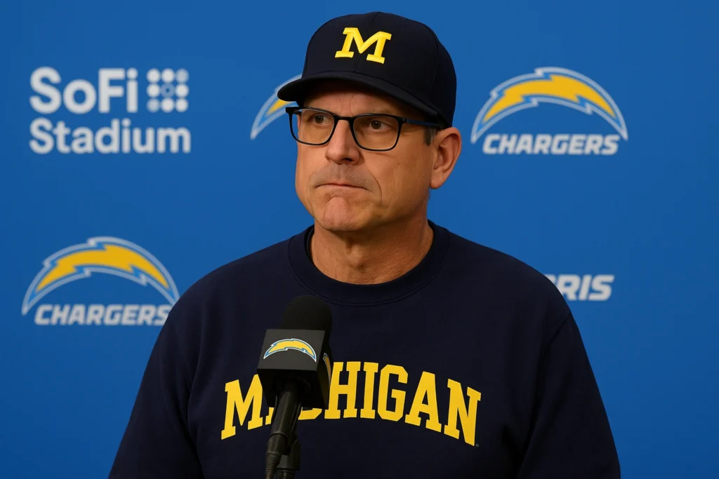 At SoFi Stadium following the Chargers’ preseason loss to the Rams, head coach Jim Harbaugh spoke briefly to the media but declined to comment on a bombshell NCAA ruling against his former program, the University of Michigan.